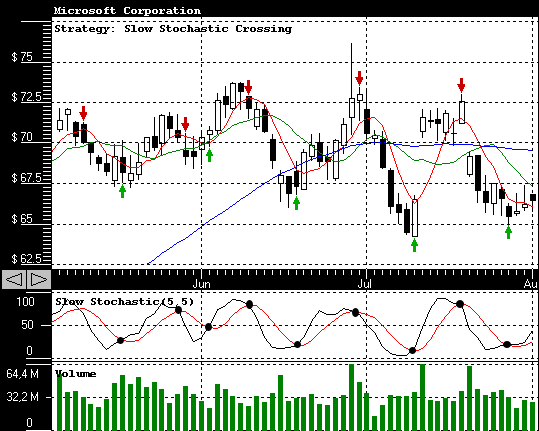 crossing %D in a downward direction it is a sell signal. When stochastic lines cross, price momentum is changing direction. Typically a more complex stochastics strategy is used, when in addition to the crossing attention is paid to the absolute level of the value. It is common to consider a buy signal when stochastics absolute value of the crossing is less than 20. For a sell, the value of the crossing could be over 80. << Back to the Stock Predictor